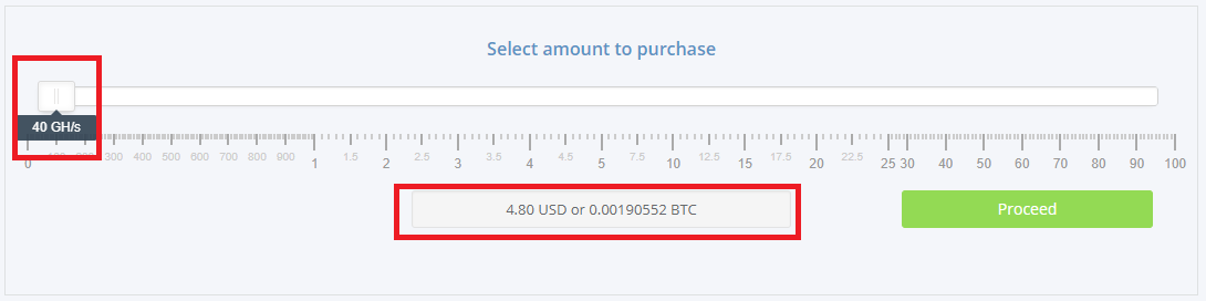di panel "Select amount to purchase" kalian tarik panel tersebut terserah kalian untuk membeli berapa GH/s saat ini saya misalkan ingin membeli GH/s di HashFlare sebanyak 40 GH/s seharga 4.80 USD atau setara dengan 0.00190552 BTC cukup murah kan untuk memulai Mining di situs ini. setelah semua panel pembelian kalian sudah atur tinggal klik "Proceed".